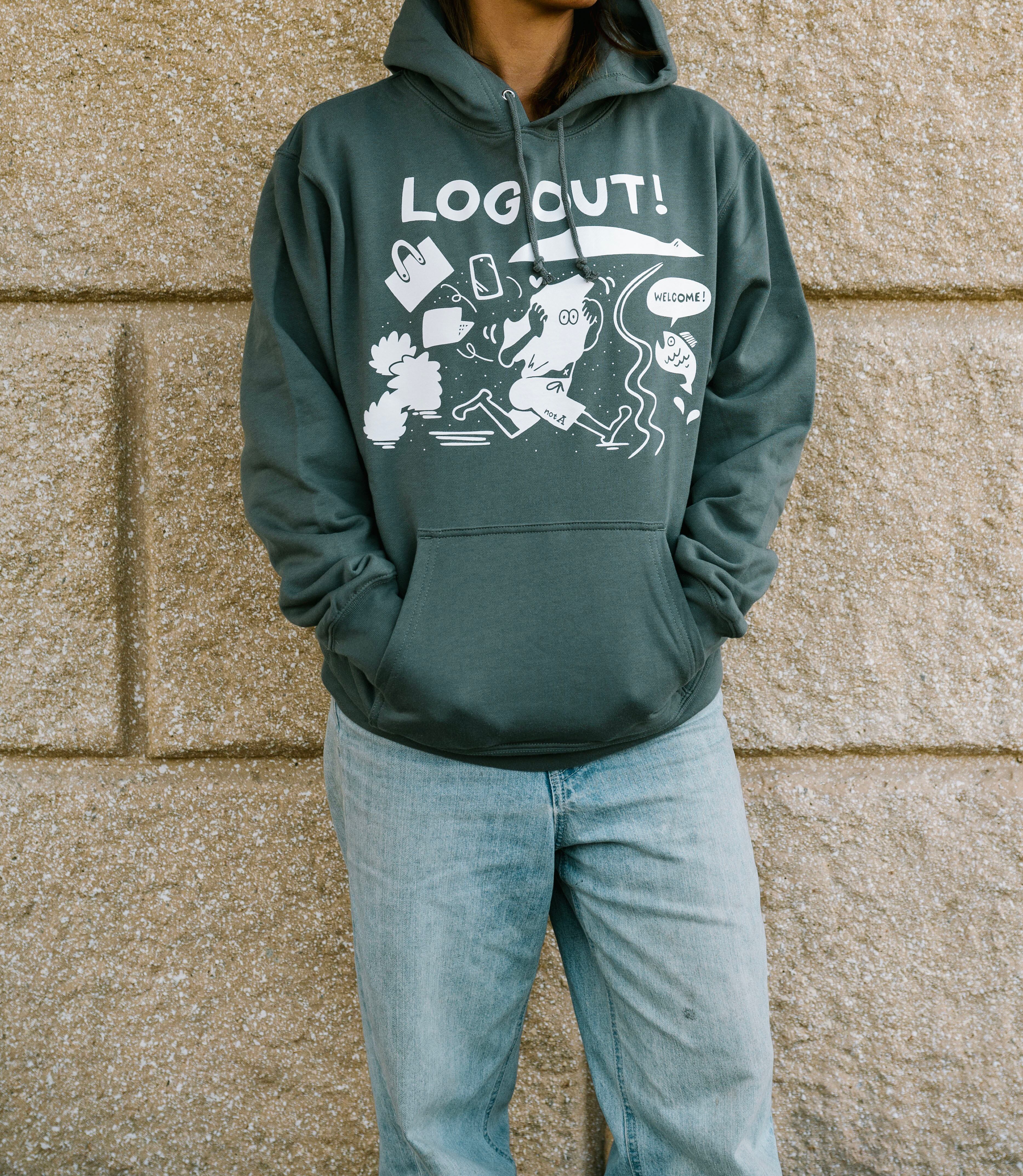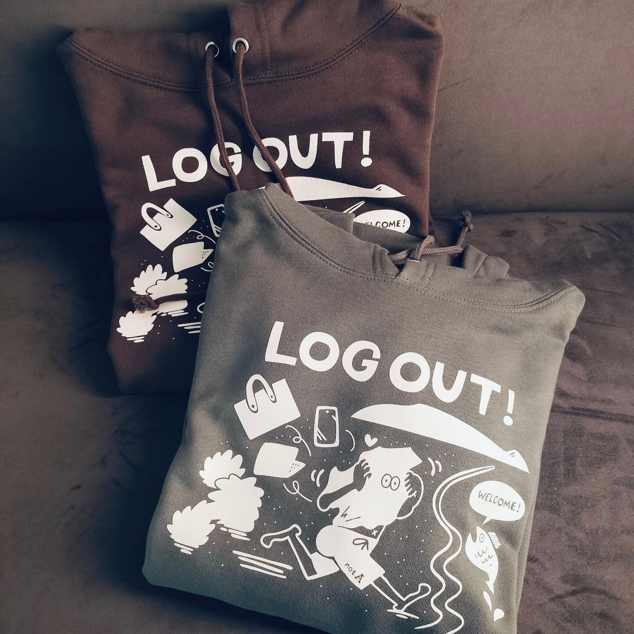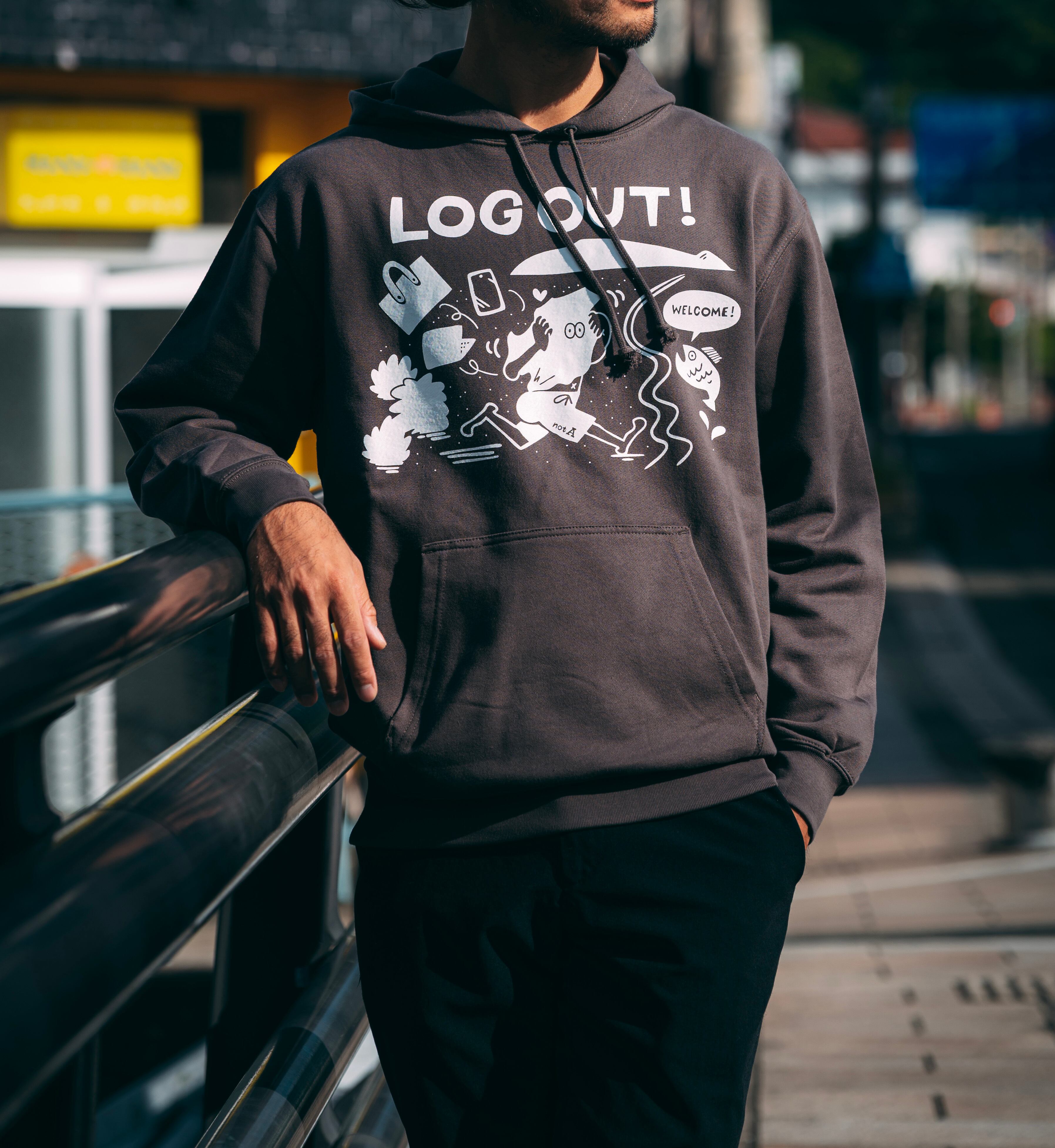 『ログアウト』休日を楽しむことをテーマにし、普段の生活や仕事を忘れて海へダイブしているデザインがフロント部分にプリントされたオリジナルパーカーです。